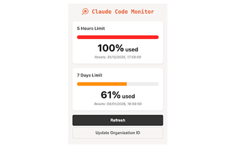 Claude Code Monitor, Claude.ai kullanıcıları için geliştirilmiş bir tarayıcı eklentisidir. Bu araç, kullanıcıların kodlama ve diğer görevlerde Claude hizmetinden yararlanırken, kullanım limitlerini anlık olarak takip etmelerini sağlar. Uygulama, 5 saatlik ve 7 günlük kaydırmalı limitler hakkında anlık bilgi sunarak, kullanıcıların iş akışlarını daha verimli yönetmelerine yardımcı olur. Ayrıca, görsel gösterge panelleri ile mevcut kullanım durumunu kolayca takip edebilirler.